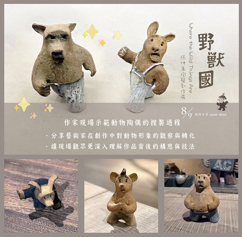 活動當日,將從報名者中選出三位幸運參與者,由本次展出的陶藝家張仲禹根據他們他們的敘述或想法,即席創作專屬動物小陶偶,公開作品幕後的製作過程!